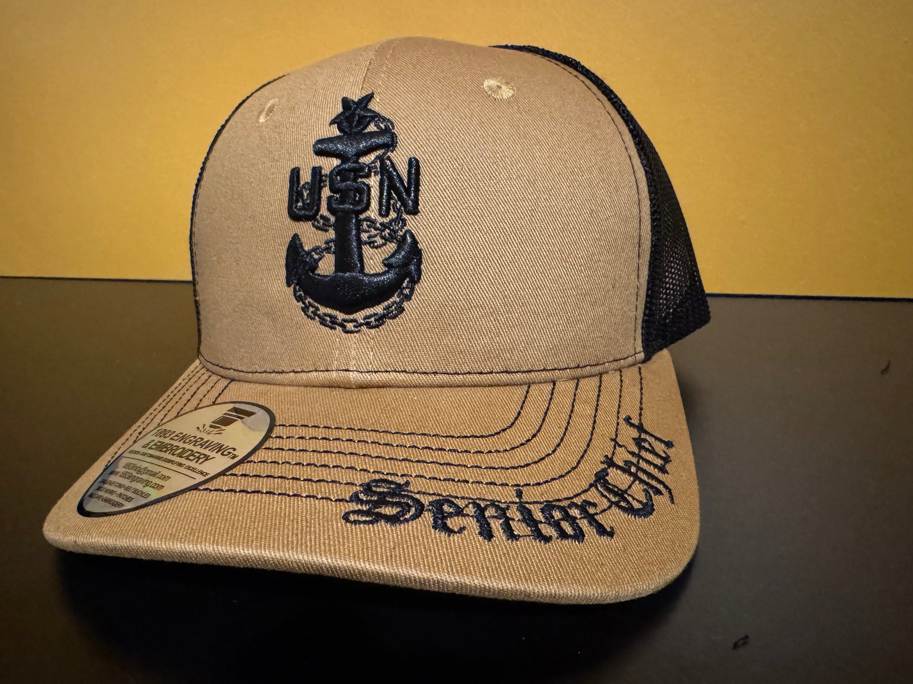 This "trucker style" adjustable snap-back premium ball cap features the US Navy Senior Chief Petty Officer anchor in puff embroidery as well as an embroidered bill.