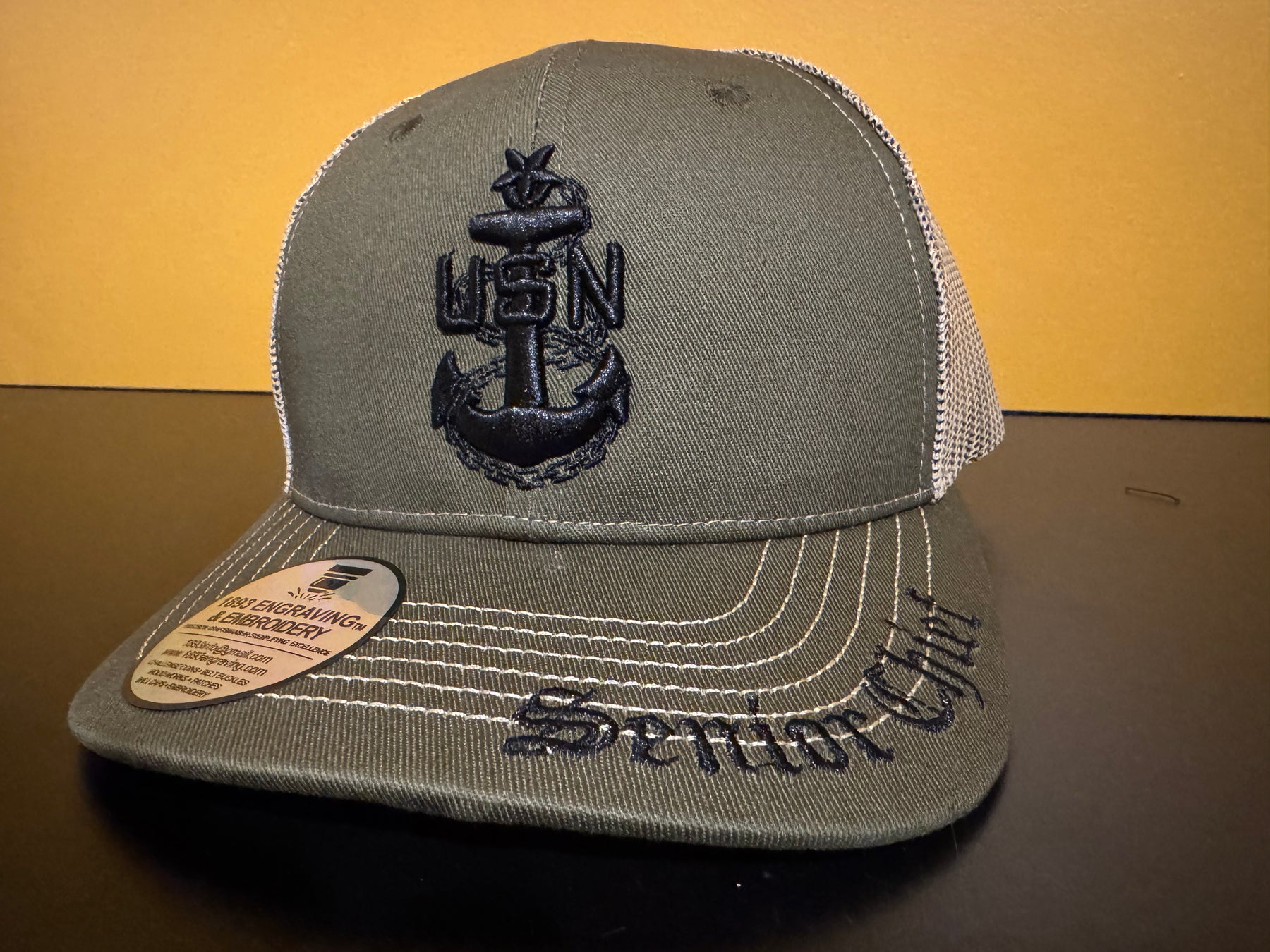 This adjustable "trucker style" snap-back premium ball cap features the US Navy Senior Chief Petty Officer anchor in puff embroidery as well as an embroidered bill.