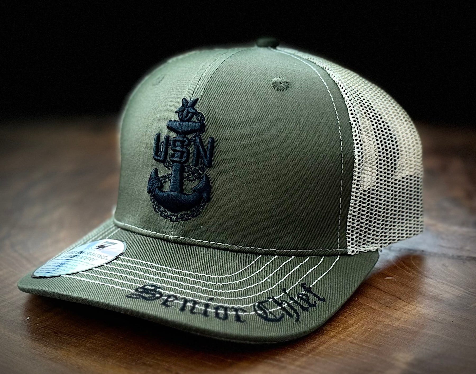 This adjustable "trucker style" snap-back premium ball cap features the Senior Chief Petty Officer anchor in puff embroidery as well as an embroidered bill.