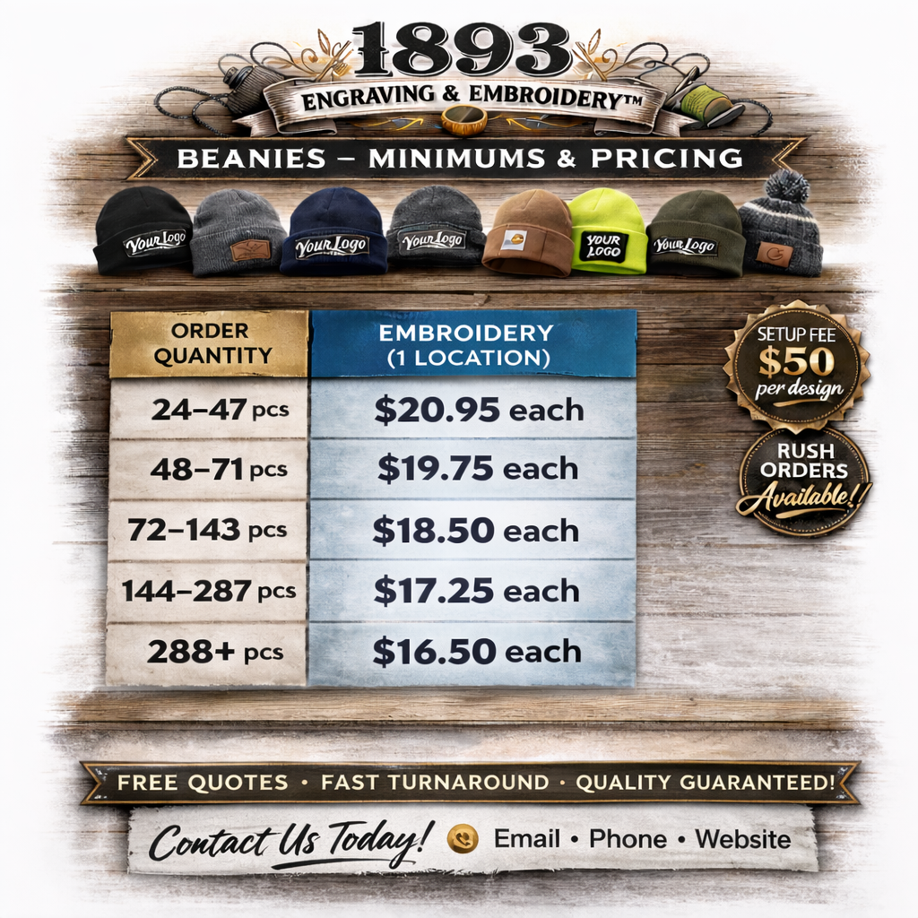 Top off your look with a beanie that’s uniquely yours. Our custom embroidery brings your design to life—perfect for teams, businesses, gifts, or unit pride.