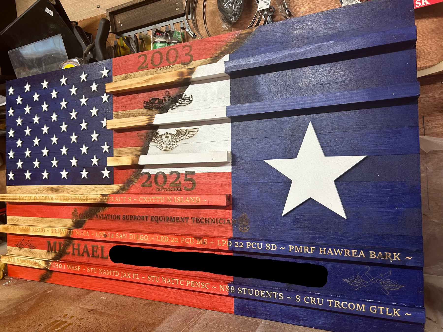 Each rack is precision cut and finished from quality wood, featuring a detailed American flag design and engravable areas for names, ranks, unit logos, dates, or custom text — making it perfect for military members, veterans, first responders, and collectors. Engravable options are limitless.